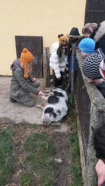 Děti byly velice zvědavé, jaká zvířátka tu potkáme. Jako první se nám představili potkani – domácí mazlíčci slečny průvodkyně. Směli jsme si je pochovat a pohladit. Děti si také vyzkoušely, jaké to je sedět na traktoru. To bylo něco pro kluky, pěkně se na traktoru vyřádili. O kousek dál jsme viděli slepičky, bohužel ještě bez kuřátek, ta byla v umělé líhni. Nejvíce se ale dětem líbili kůzlátka, králíčci a morčátko. Na farmě žily i kravičky, ovečky, kočička, nechyběl ani býk a beran. Nakonec nás přišlo pozdravit prasátko, které si hned lehlo na záda a vystrčilo na nás macaté bříško. To bylo krásné zakončení našeho putování.