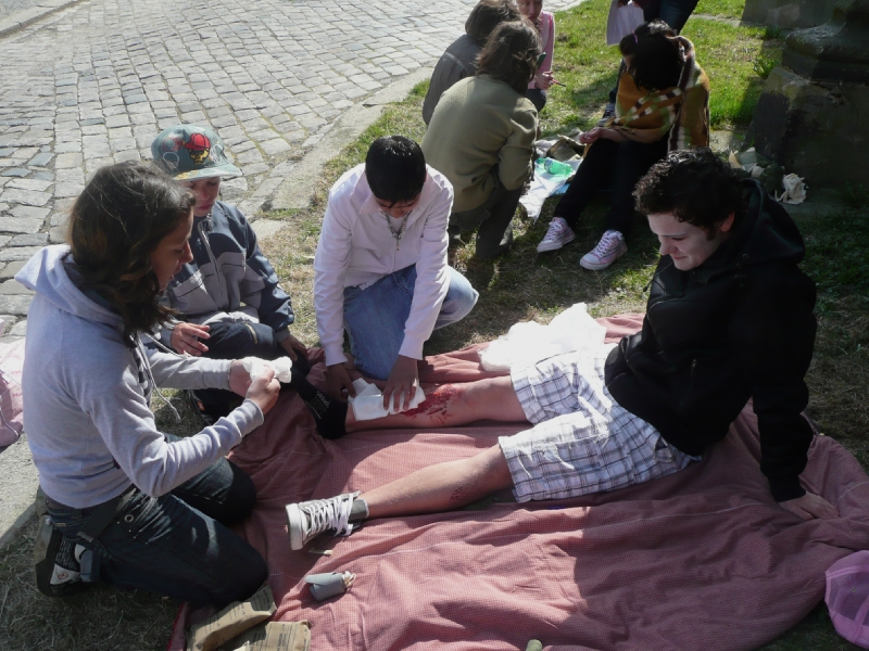 Děti si na pěti stanovištích vyzkoušely různé druhy obvazové techniky, ošetření několika poranění a přenos zraněných.