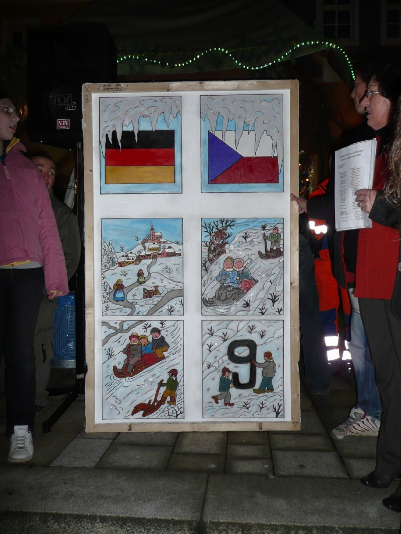 Společně s německou školou jsme si připravili krátký vánoční program, který proběhl odpoledne po 17 hodině přímo u vánočního stromku před radnicí města. My jsme toto vystoupení pojali v náladě Josefa Lady, zazněly krásné koledy, básničky o zimě a dívky z osmého ročníku zahrály na flétny. V samotném závěru vystoupení jsme si všichni zazpívali německou koledu.Obě školy sklidily velký úspěch a po krásném vystoupení došlo k tolik očekávanému rozsvícení 9-tého adventního okénka.