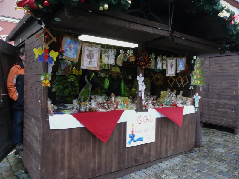 Vpředvečer letošního 1.adventu, v sobotu 28.11.2009, byly na chebském náměstí zahájeny tradiční vánoční trhy. V dřevěných stáncích se již druhým rokem objevily výrobky žáků místních základních a mateřských škol. Také Základní škola z Kostelního náměstí obsadila jeden z vánočních stánků, kde mohla prezentovat velmi zdařilé výrobky svých žáků. Rodiče, prarodiče, přátelé a známí měli jedinečnou možnost zakoupit obrázky malované na hedvábí, závěsné andělíčky, vánoční ozdoby a mnoho jiných zajímavých drobnůstek, které k vánočním svátkům patří.