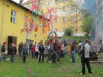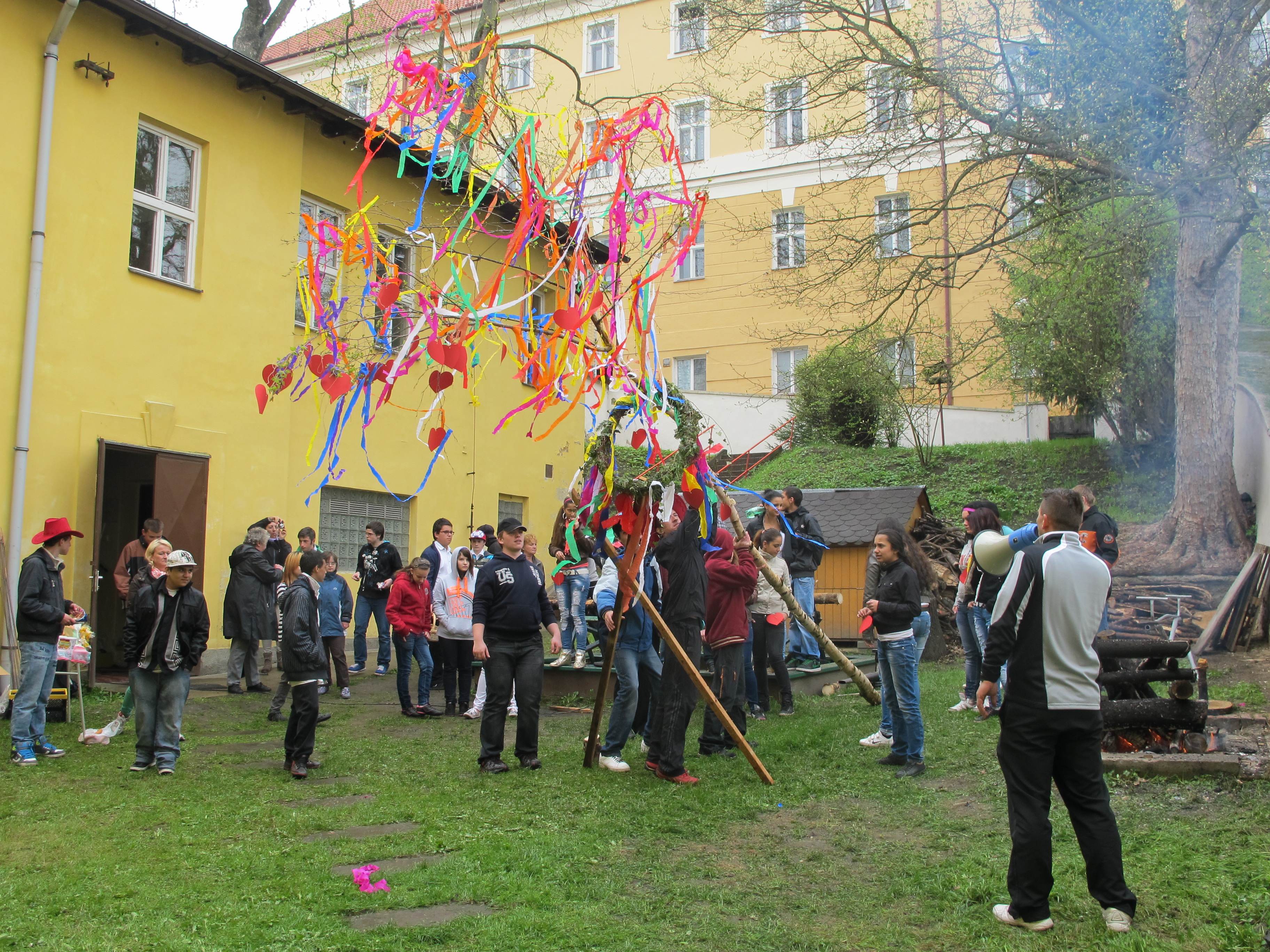 Jednou z tradic naší školy je májová slavnost spojená se zdobením a stavěním májky na školní zahradě. Letos nám počasí moc nepřálo, a tak jsme si během dopoledne povídali o tradici tohoto zvláštního dne, o stavění májky na vesnici, zapalování ohňů a pálení čarodějnic. Po příjezdu přátel z města Marktredwitz slavnosti konečně začali. Děti si nejprve společně zatančily a zazpívaly, poté je čekala naše zahrada a zdobení májky. Proužky krepového papíru se za pomoci učitelů rázem přestěhovaly do koruny břízky, tak jsme jí usadily do země a už tu stála májka v celé své kráse. Zanedlouho se rozhořel oheň a přišel ten správný hlad na pečený vuřtík. Kdo neopékal, šel si zazpívat, kdo nezpíval, soutěžil v řezání dřeva. Bylo to vskutku radostné dopoledne, ale hlavně jsme měli radost z dobře vykonané práce a z vyzdobené zahrady.