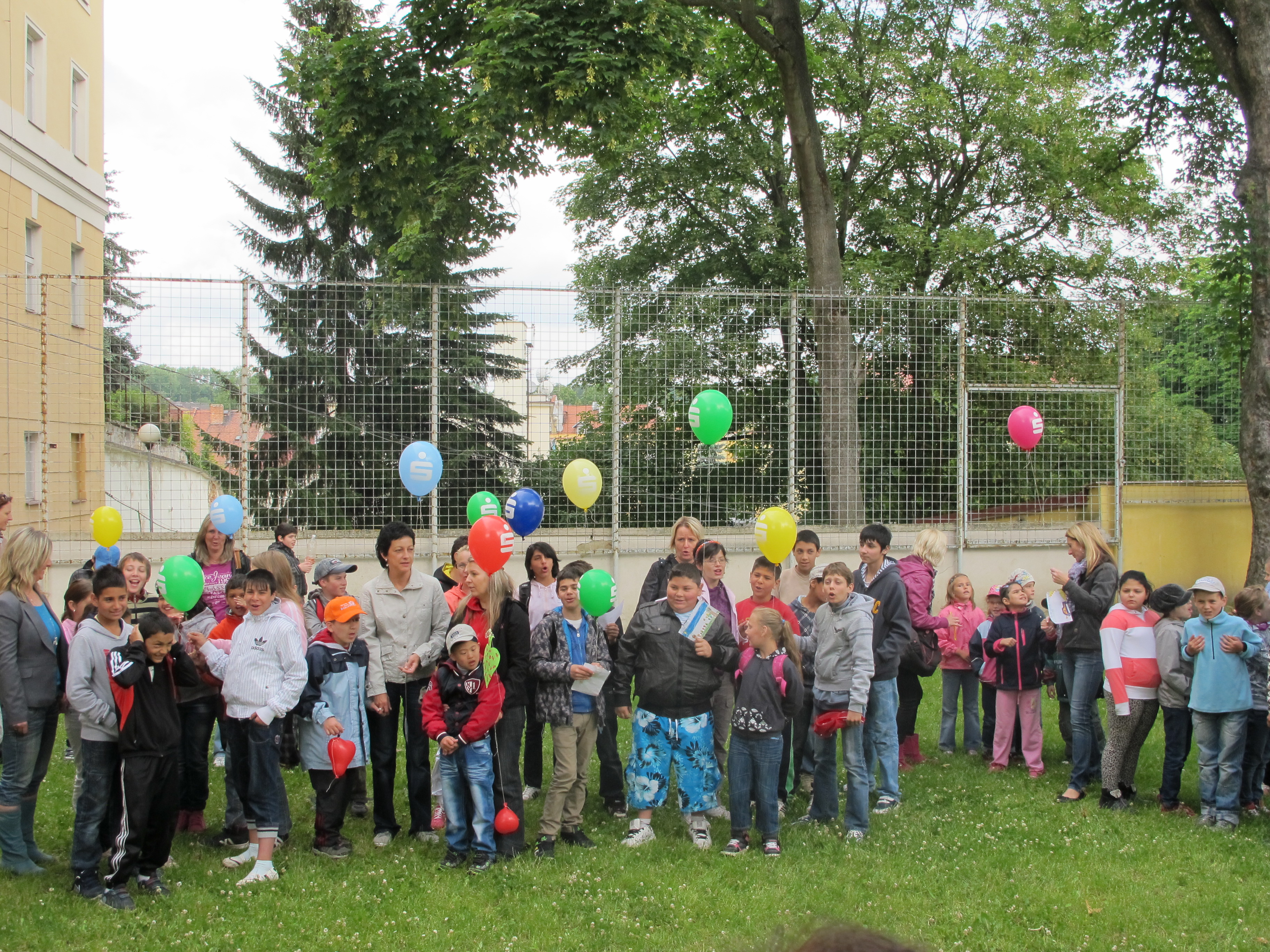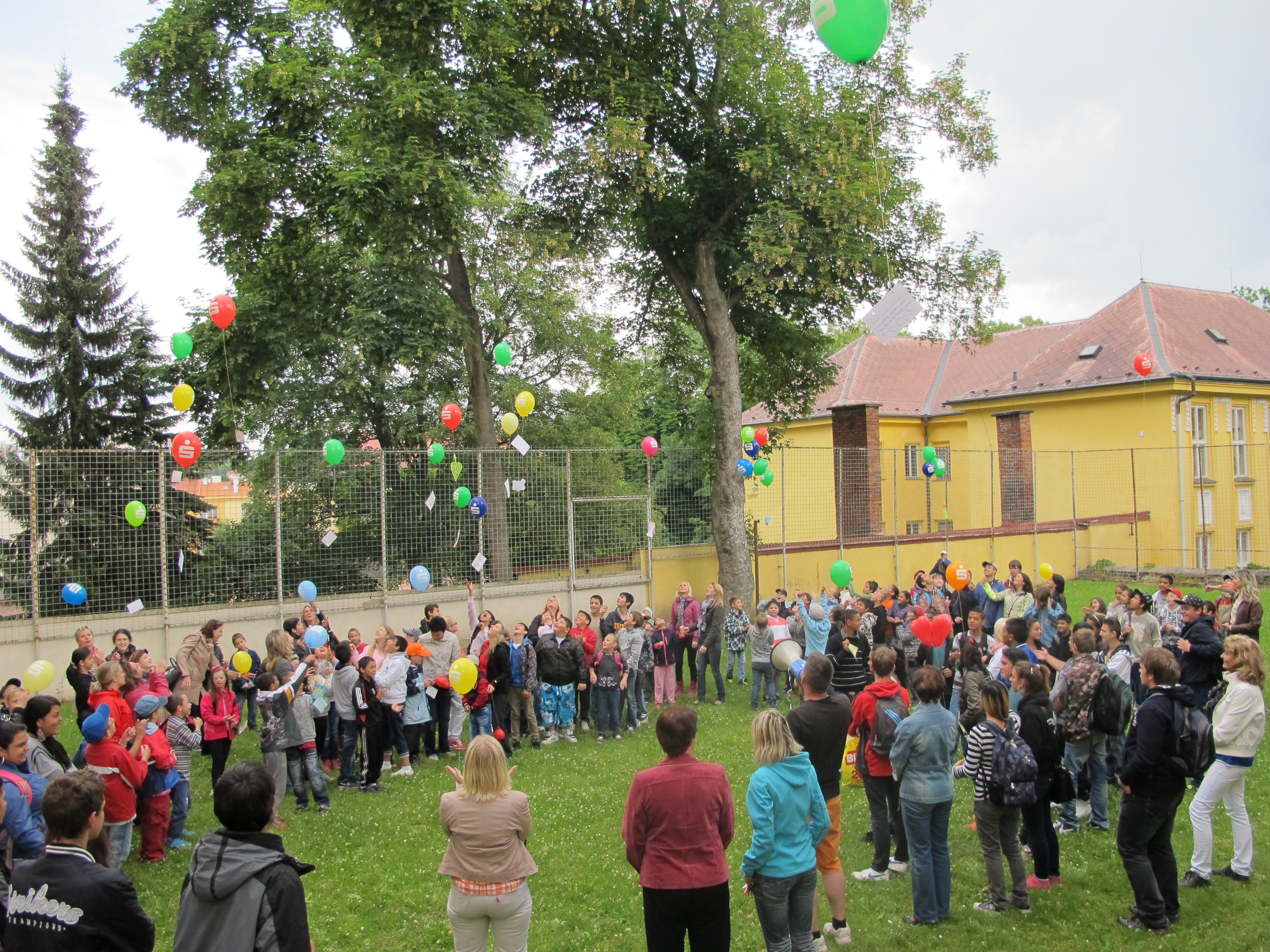 Zase nám skončil jeden školní rok, a protože důstojné rozloučení se školou je u nás pomalu samozřejmostí, rozhodli jsme se tuto tradici neporušit. V letošním roce jsme se pustili do pouštění balónků. V průběhu června si každá třída vytvořila papírové přání s libovolným obsahem, určené k zavěšení na balónek. Ve čtvrtek 28. června po pokřiku hesla ZAVÍRÁME ŠKOLU – PO PRÁZDNINÁCH ZASE SPOLU se z megafonu ozvalo: tři…dva.. jedna..TEĎ, a k nebi se vzneslo 40 balónků. Byl to opravdu nádherný pohled na plnou oblohu pestrých barev. Doufejme, že vypuštěná přání se vyplní, hlavně ať prázdninový čas běží pomaleji než čas školní. Přejeme všem příjemně prožité prázdniny, hodně sluníčka, skvělých kamarádů a dobrý vstup do nového školního roku.