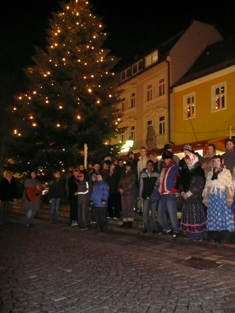 Sobotní jarmark zpestřilo vystoupení chebských dětí. Své místo v programu si našly i děti ze Základní školy Kostelní náměstí. Ti starší, převážně z druhého stupně, zazpívaly tradiční vánoční koledy, na řadu přišla říkadla a milým překvapením byla i vlastní školní hymna. Přítomní si vyslechli i jednu koledu německou, kterou paní učitelka zařadila do repertoáru záměrně – přivítali jsme na trzích návštěvu z německé praktické a speciální školy v Marktredwitz. Jedná se o dvě partnerské školy, které se společně se školou naší účastní projektu „Lena a Jens“ - /Leben mit Nachbar – Je náš soused/.
